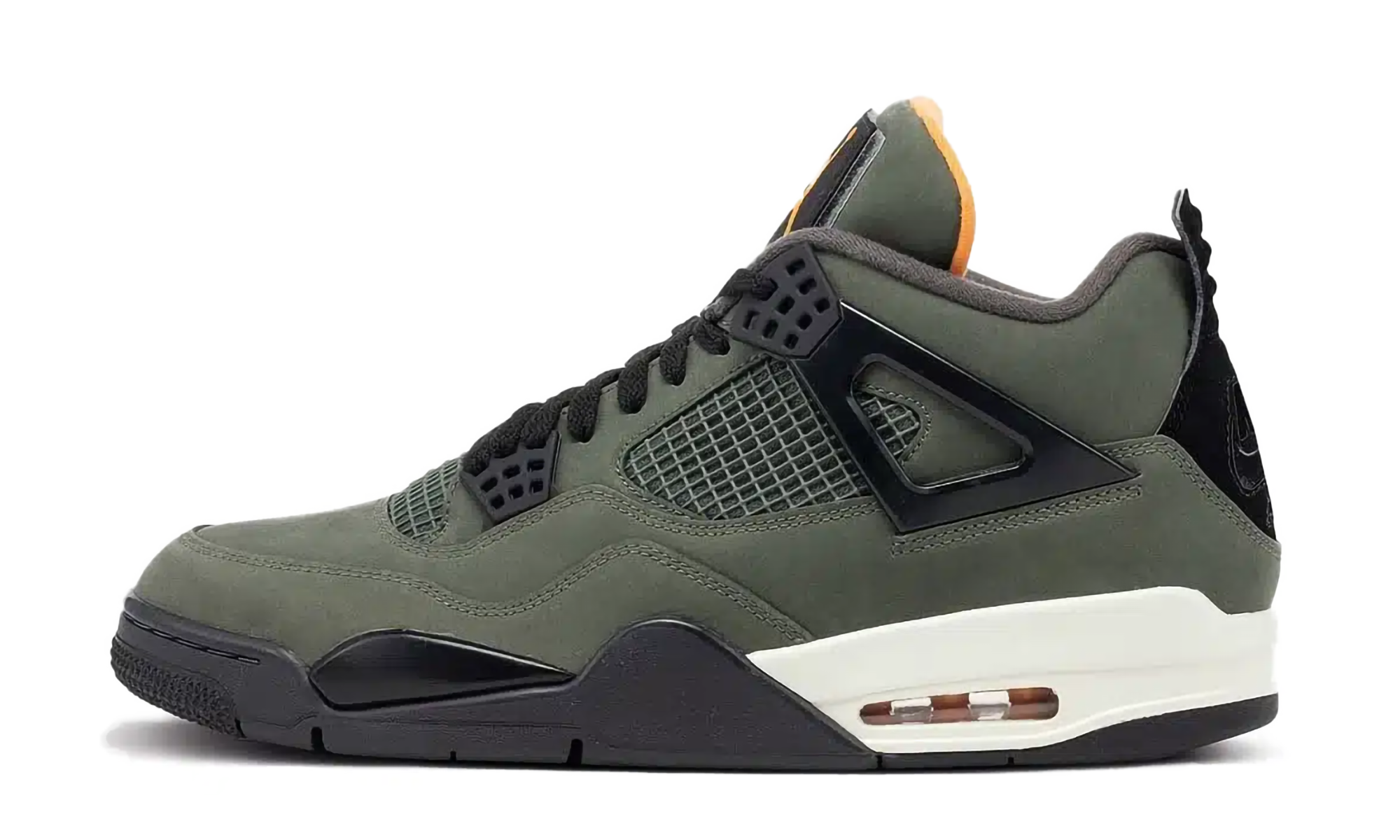 Het bovenwerk is vervaardigd uit premium olive green nubuck, geïnspireerd op MA”‘1 flight jackets””een subtiele maar krachtige verwijzing naar Undefeated’s militaire roots. Zwarte mesh panels en TPU-wings geven structuur en technische finesse, terwijl opvallende oranje details (zoals de voering en tongstick) knipogen naar de signature binnenvoering van echte MA”‘1-jassen.